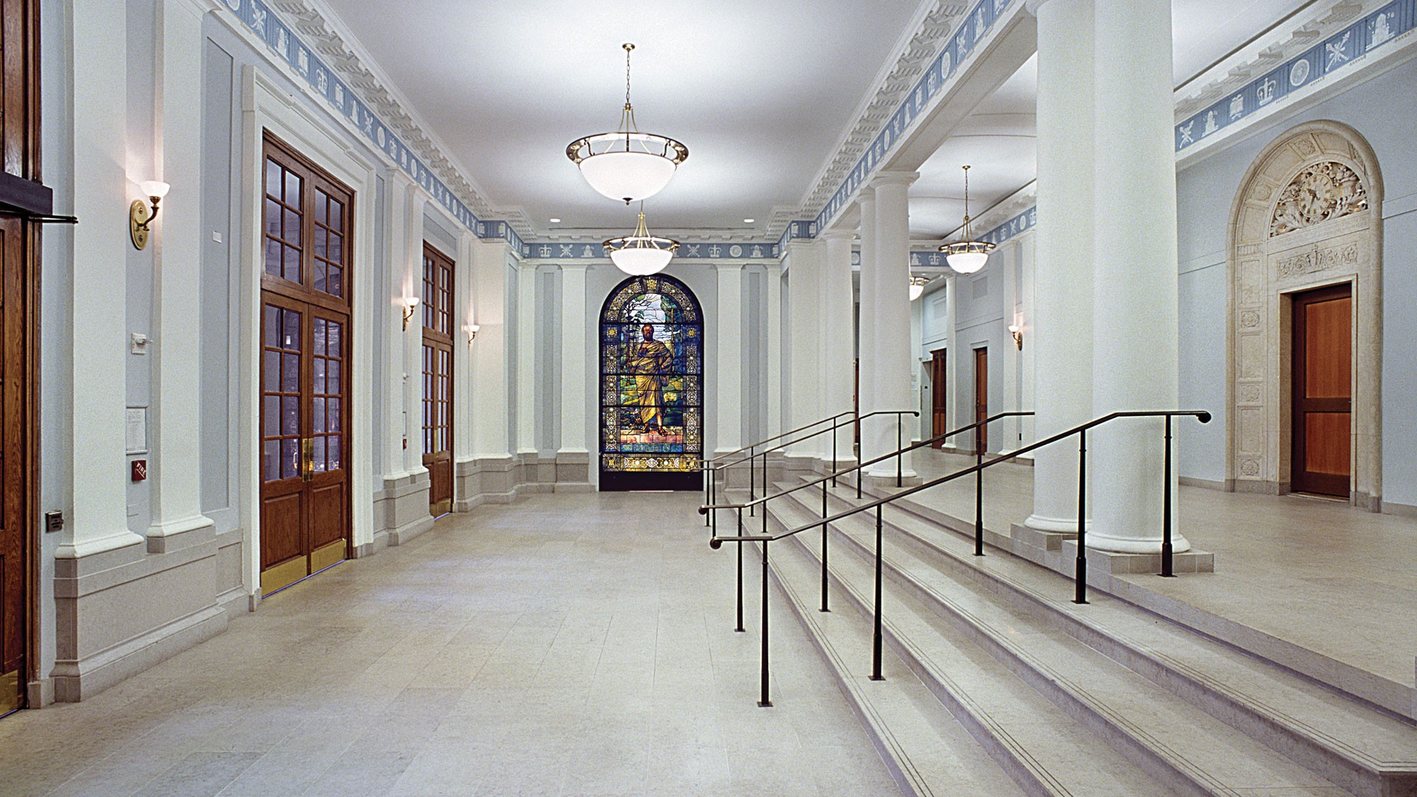 The restoration emphasizes the importance of the historic home of Columbia College. Archival studies identified original elements to reconstruct and restore. The ground floor entrance lobby has new marble floors, replicated lighting fixtures, restored frieze, and two monumental stained glass windows borrowed from another campus building. The Dean’s Office and the Center for the Core Curriculum are new spaces with oak paneling designed in the spirit of McKim, Mead & White.