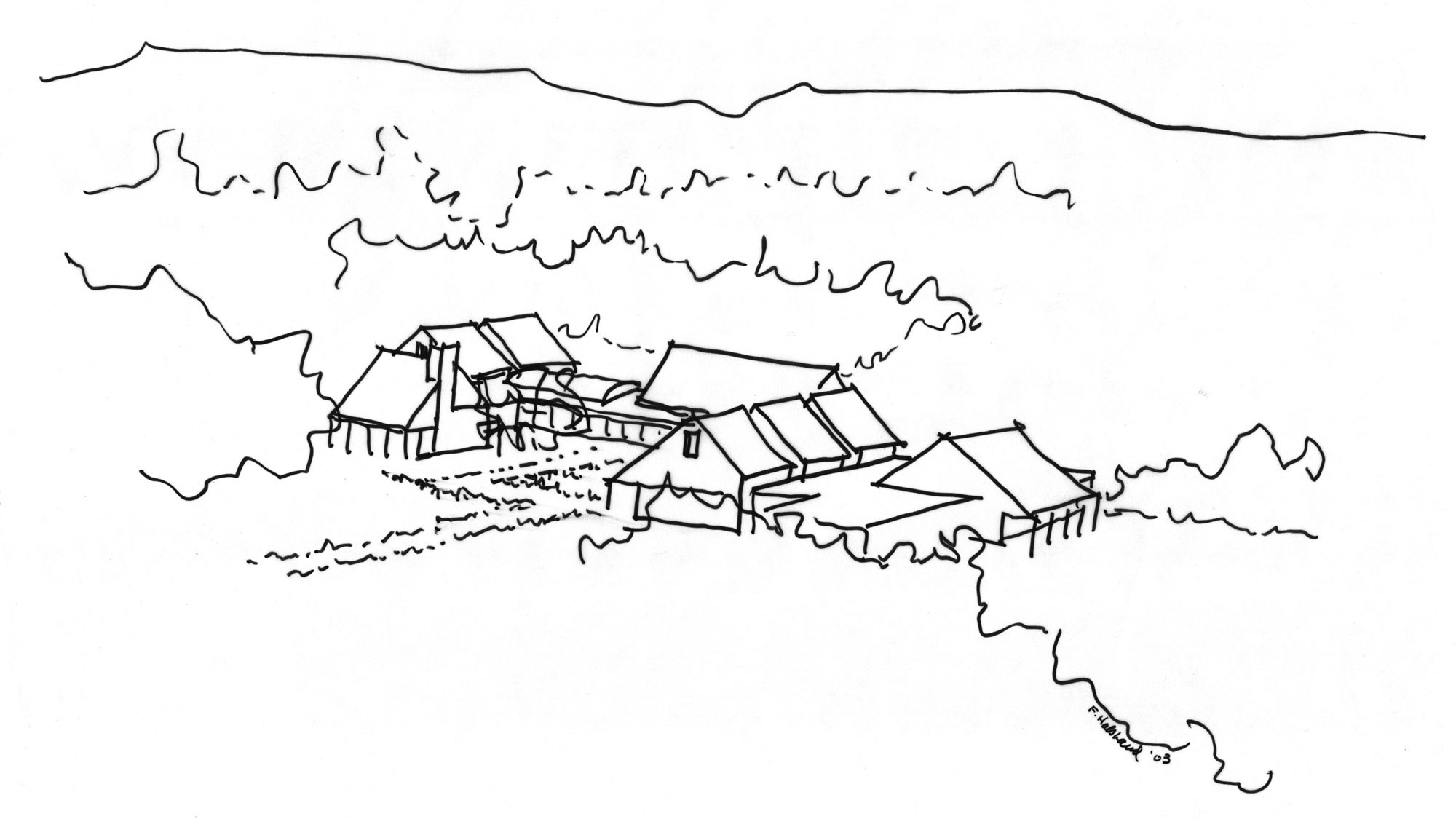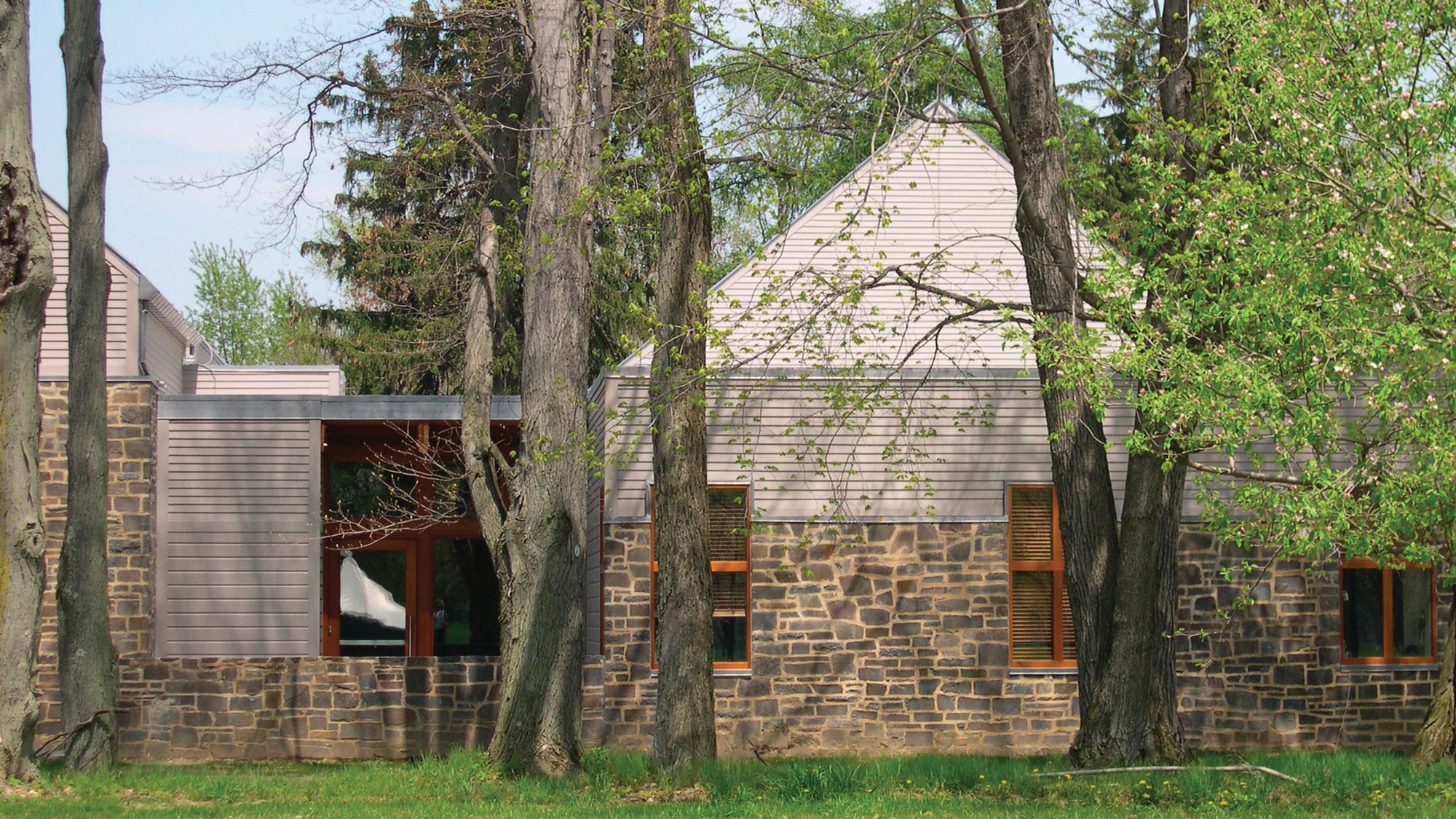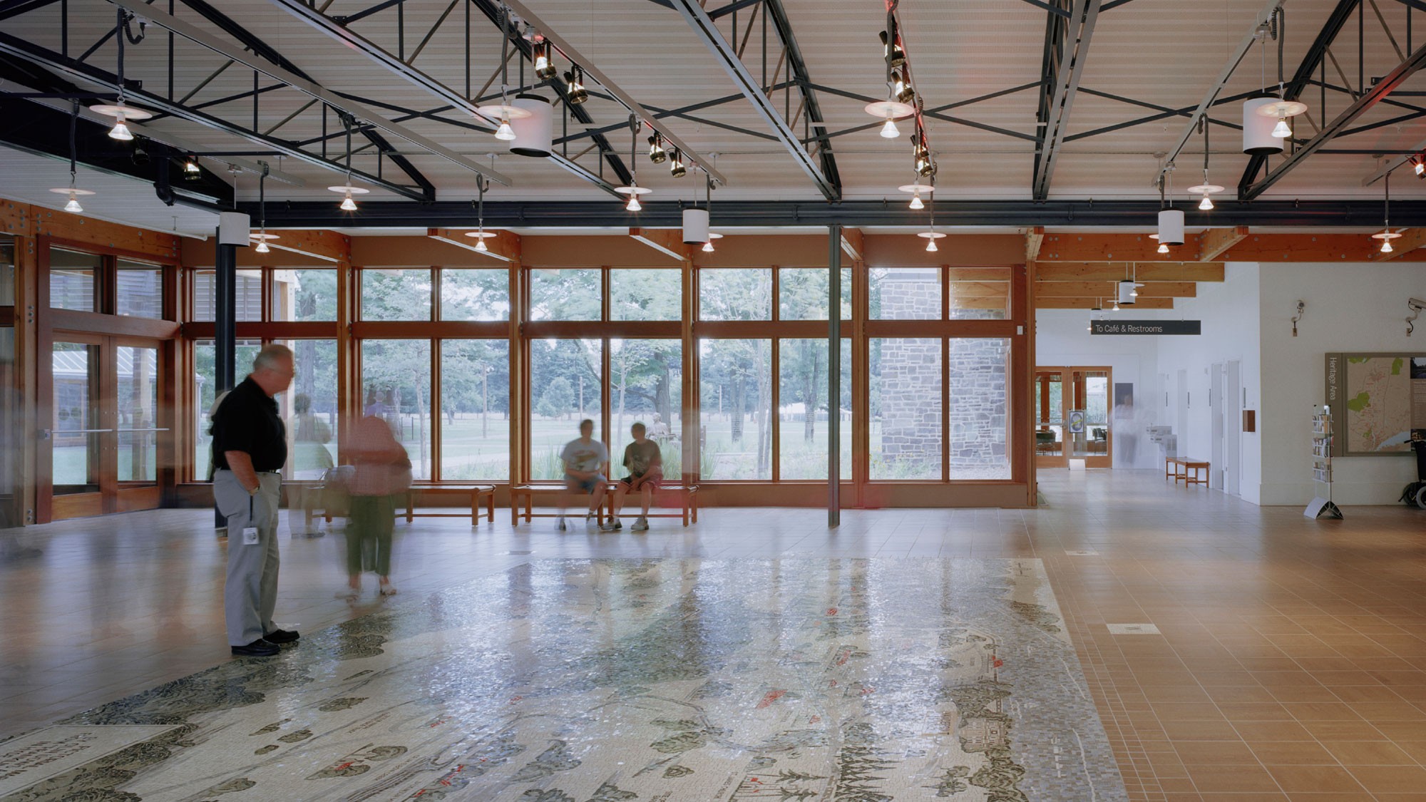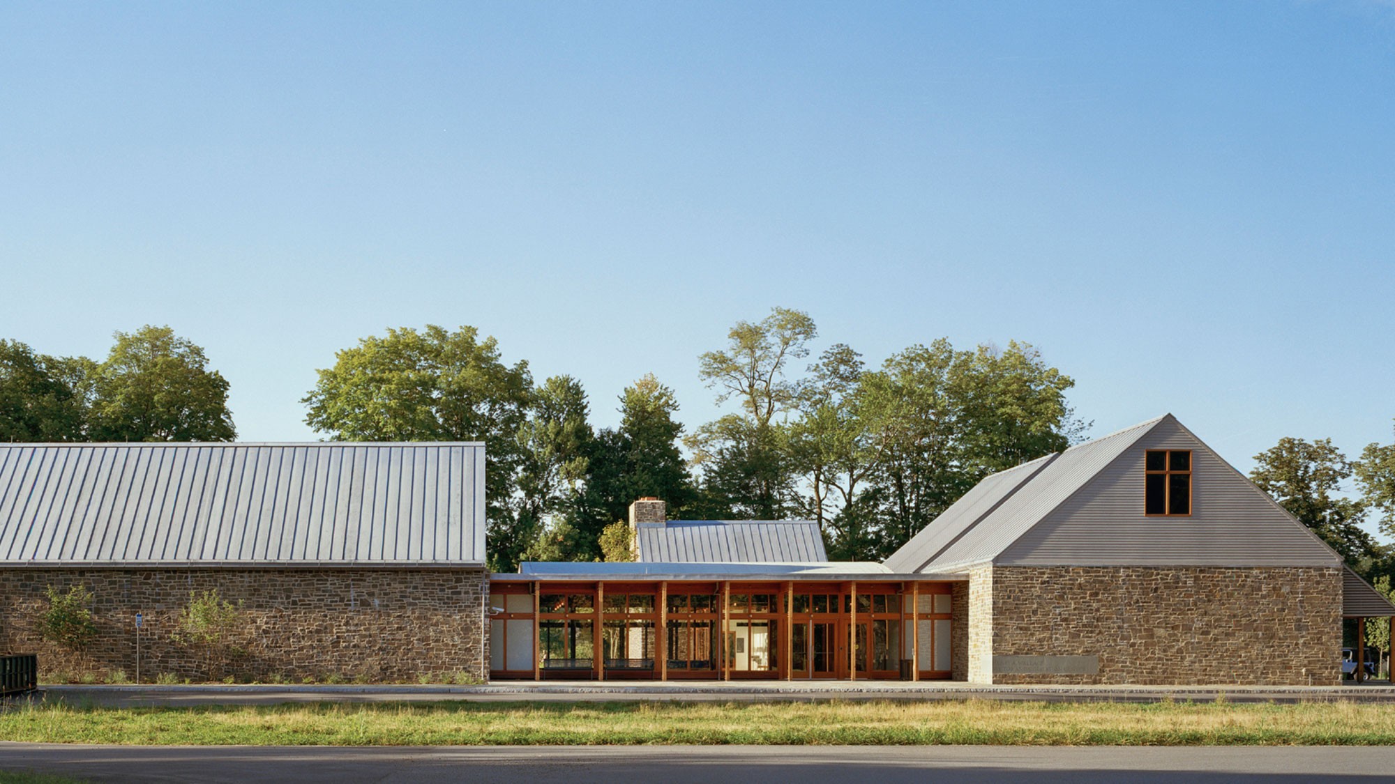 The building is composed of a series of pavilions that relate in form and structure to the Library and Museum and recall the historic Dutch Colonial architecture of the Hudson Valley. Gable roofs, fieldstone walls, and long porches protect the building from summer sun and provide gathering places. The pavilions house the principal public spaces of the visitor center: orientation lobby, auditorium, education center, gift shop, and café.