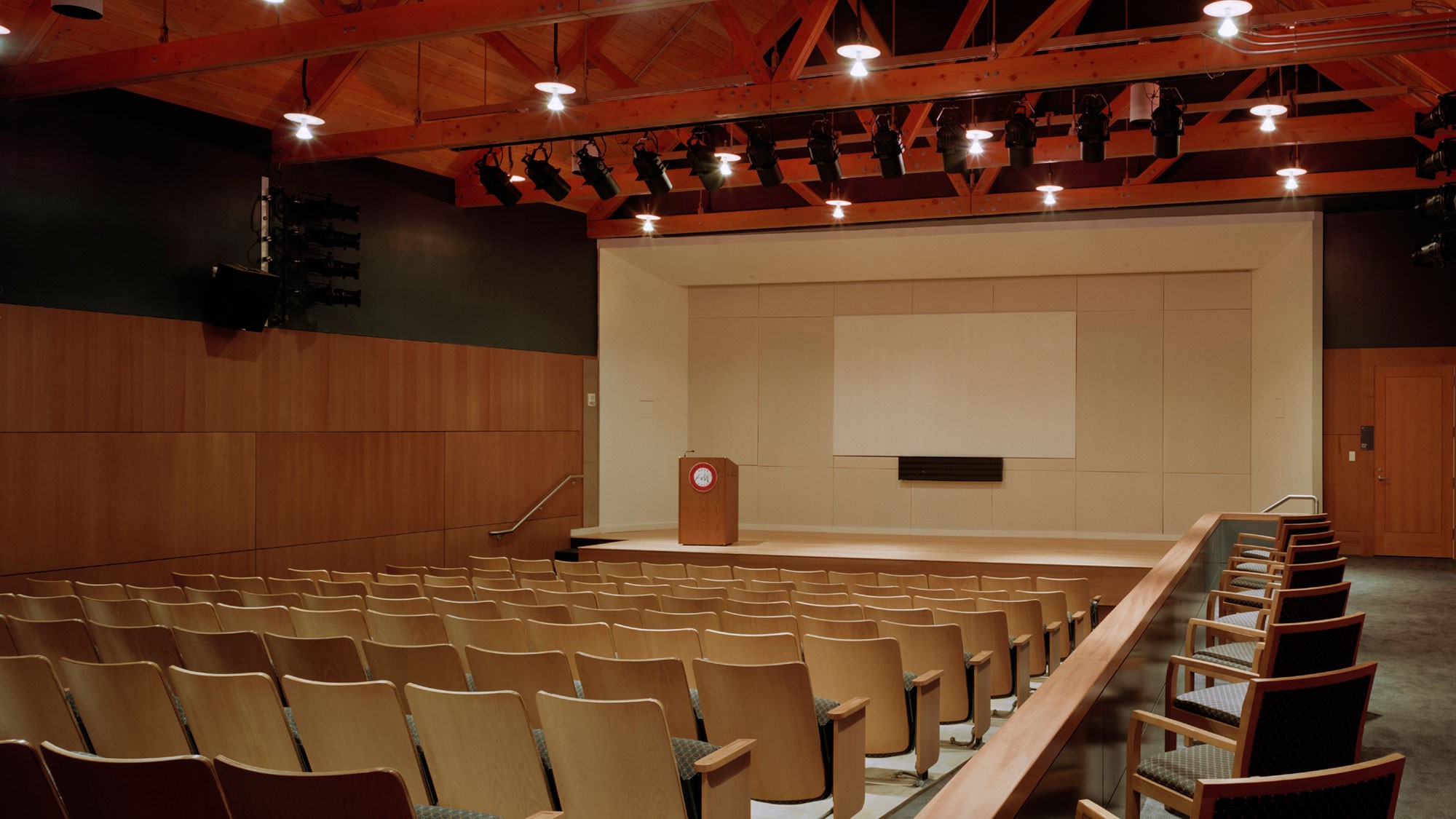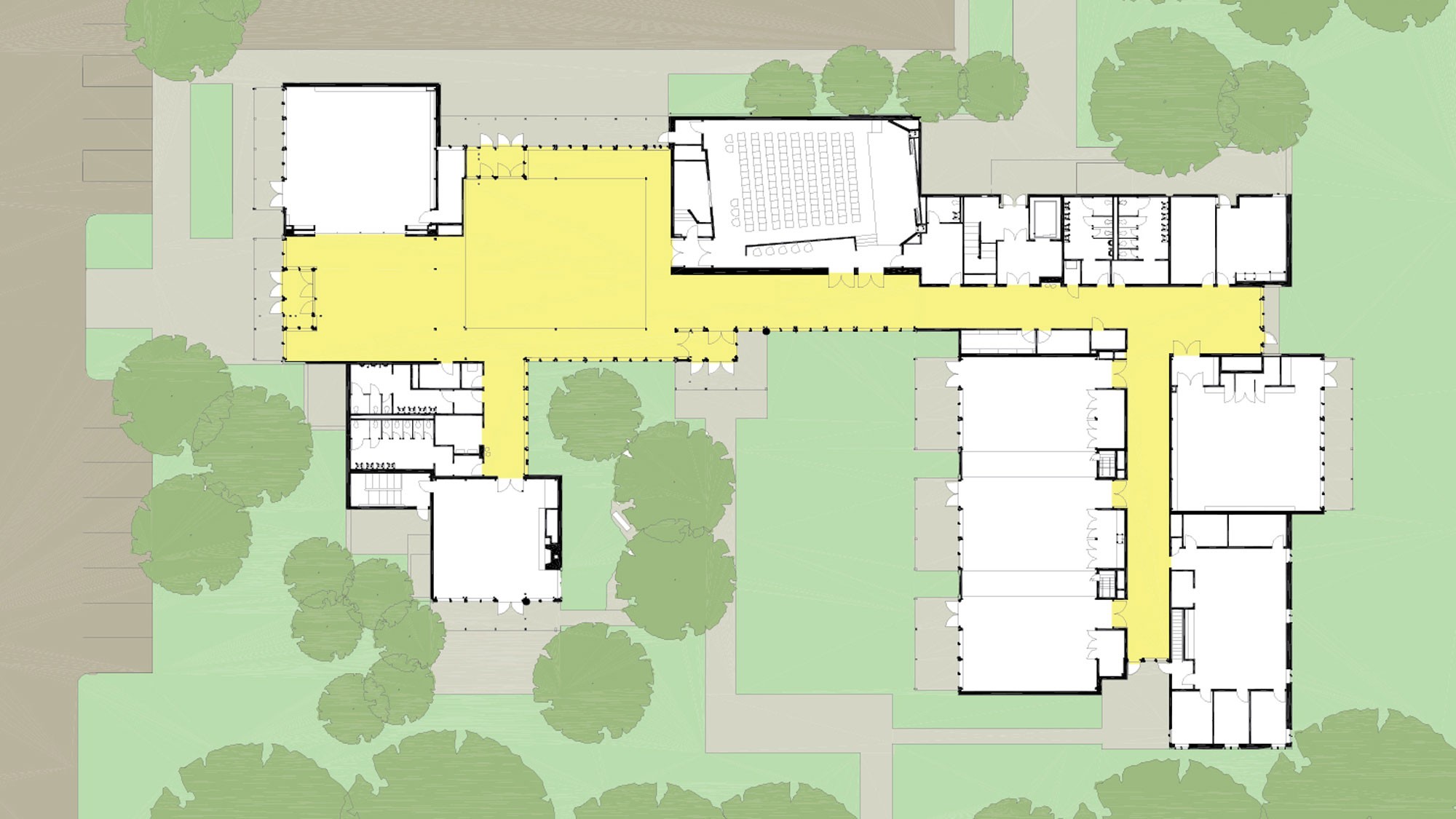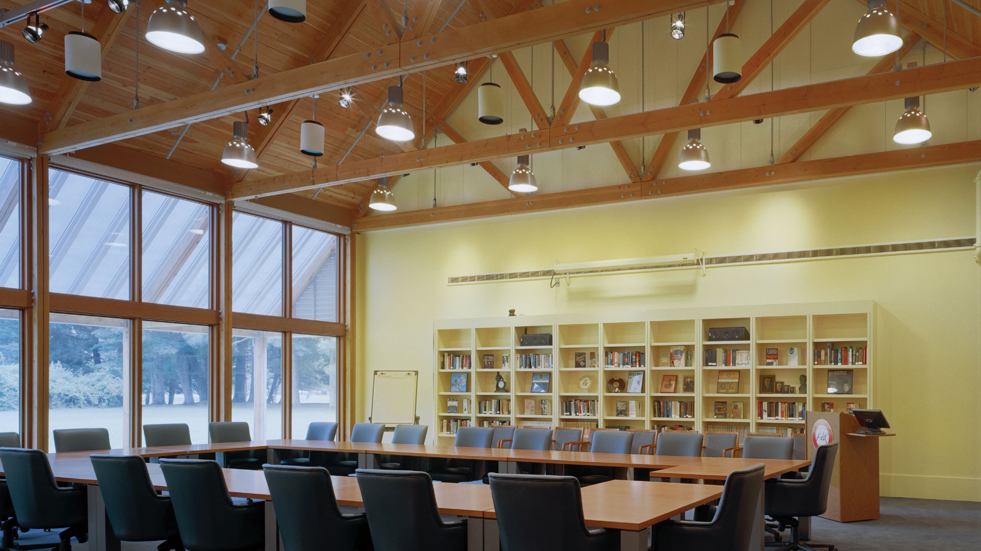 The Center opens onto and shapes adjacent landscapes. Two entrances provide separate access for groups arriving by bus and automobile. The café and multipurpose rooms open onto the courtyard, which is a gathering space for visitors proceeding to the Library and Museum. The conference rooms open toward the neighboring Beatrix Ferrand Garden. New roads and parking are located to provide minimal intrusion on historic vistas and landscapes.