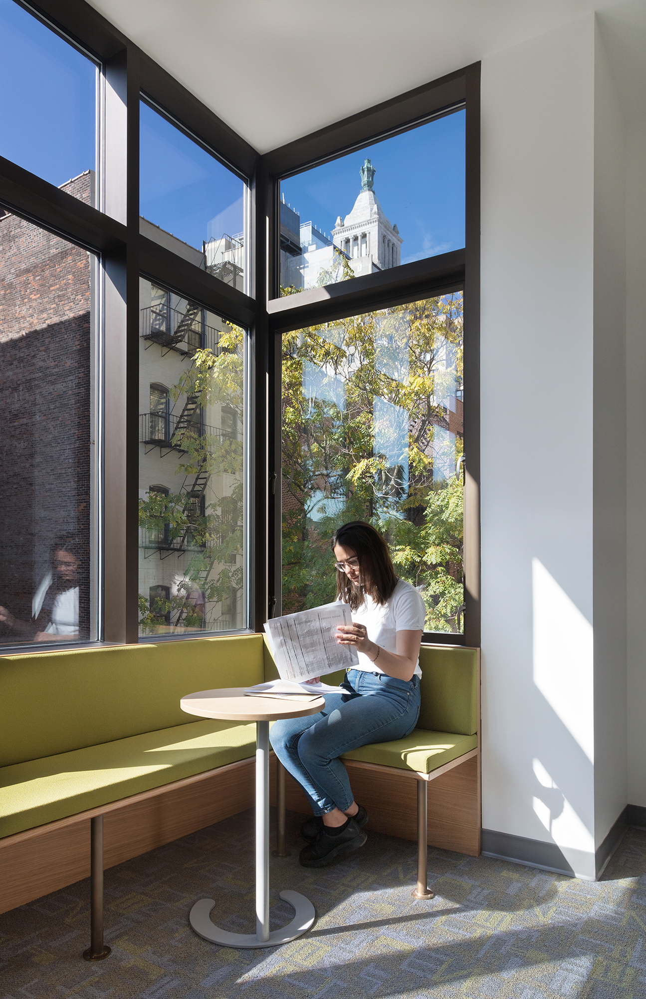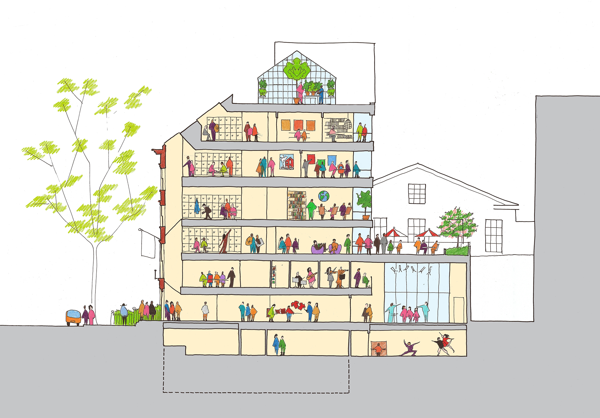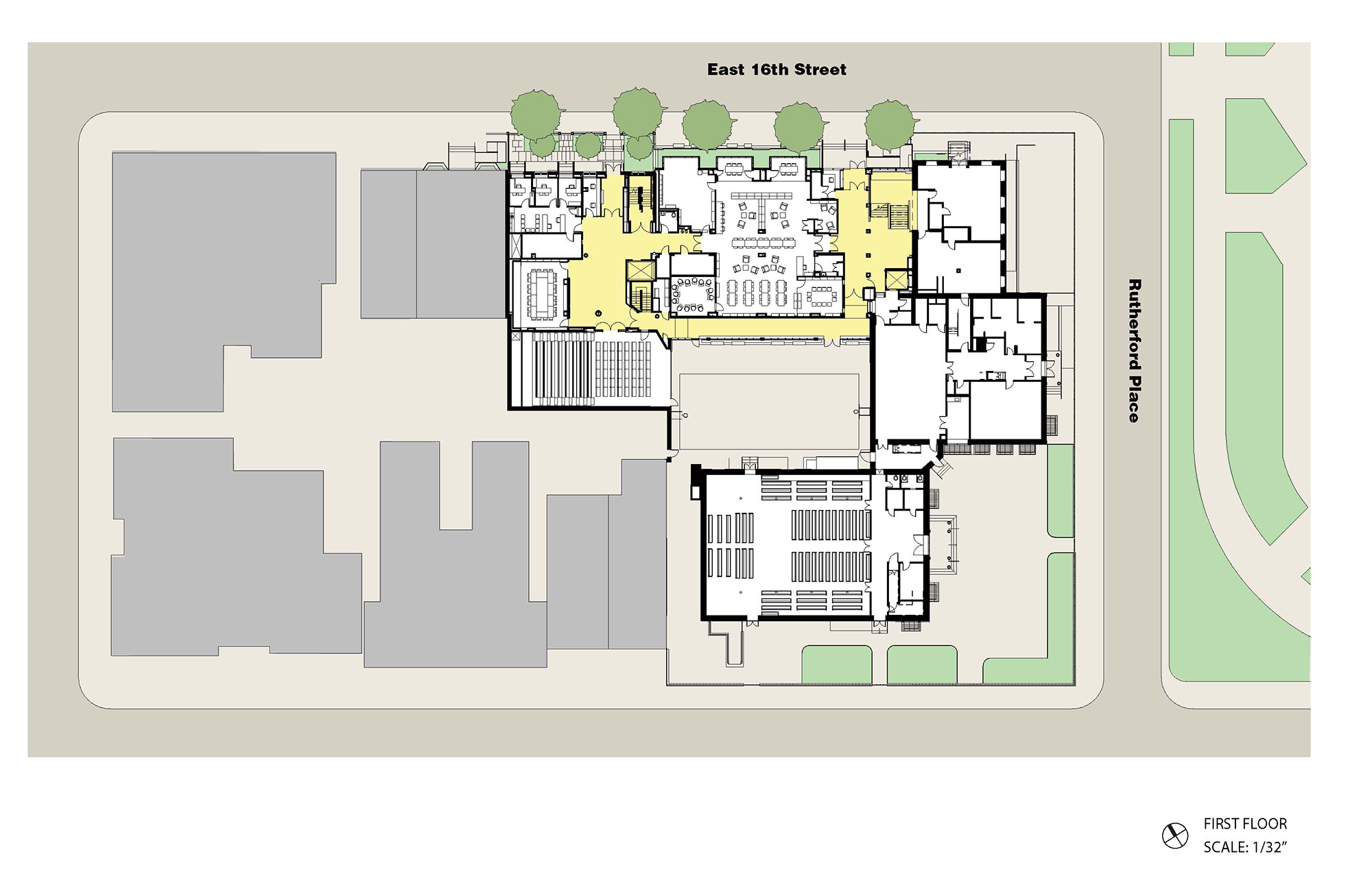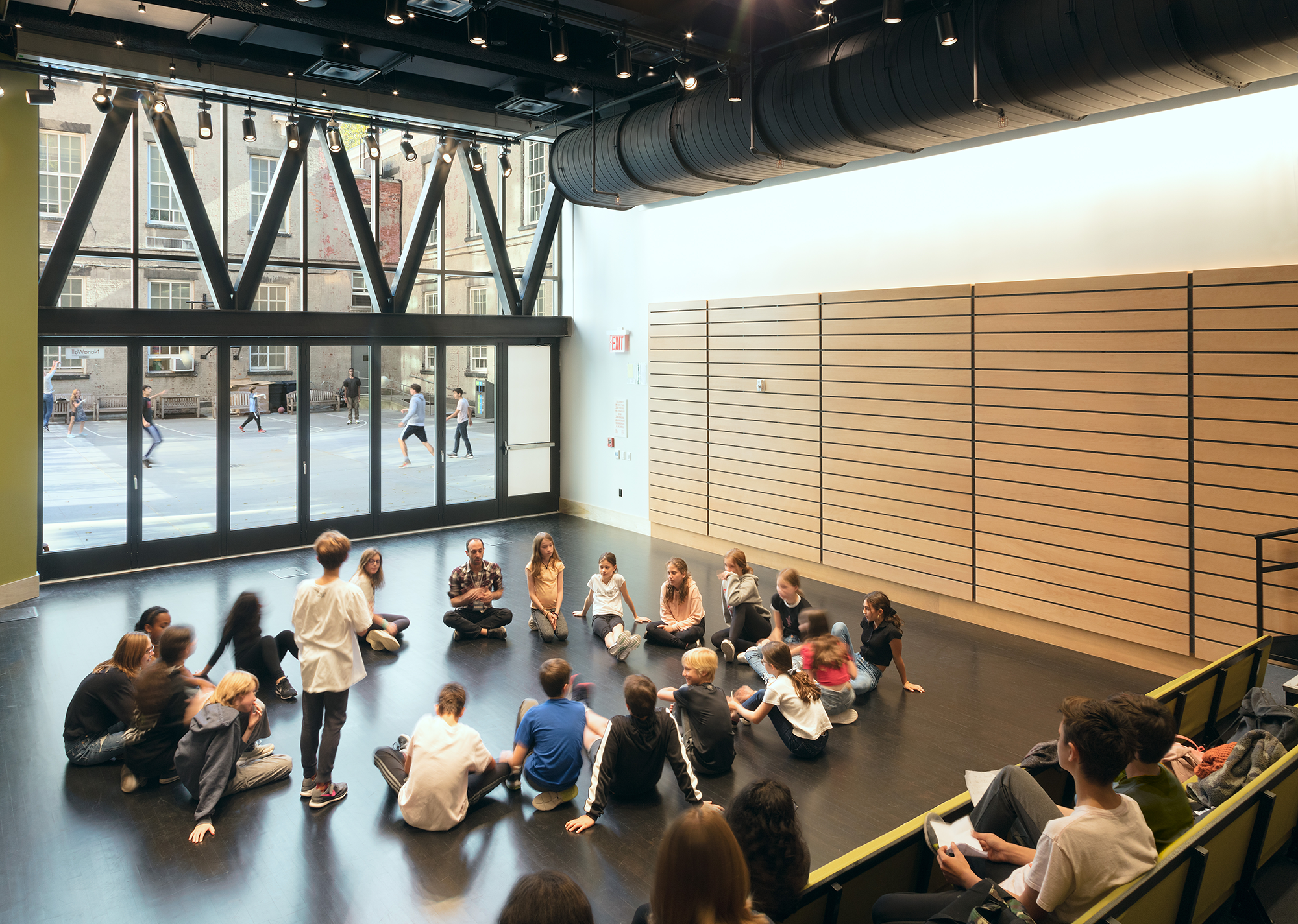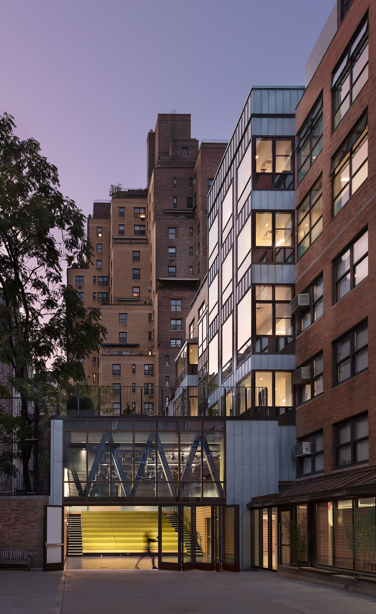 The project includes a new accessible entrance and lobby, a Great Room opening directly onto the central court, the Archive Room, a Music suite, Dance and Yoga suite, an Upper School Commons opening onto a rooftop terrace and community space, additional classrooms and offices, study and locker spaces, a rooftop greenhouse and mesh enclosed play structure, important connections to nature and landscape in a dense urban environment.