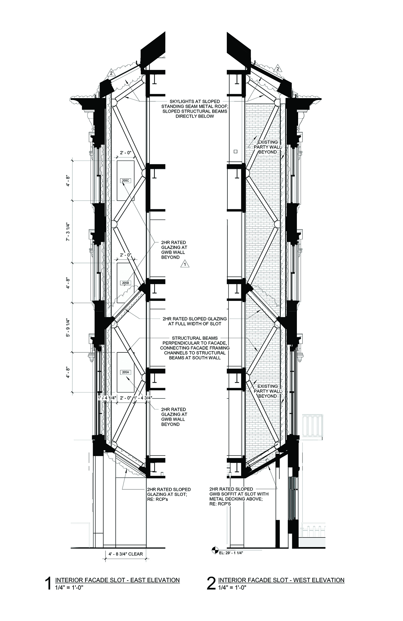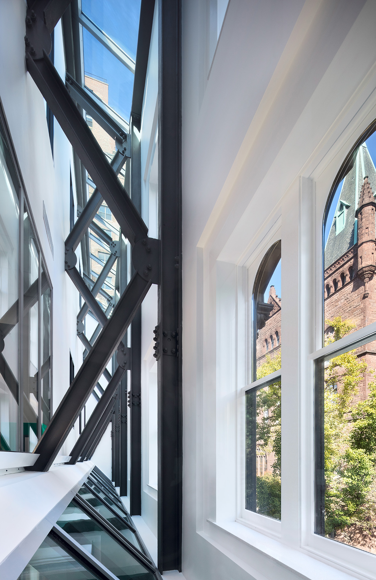 Friends Seminary is located in Stuyvesant Square Historic District in New York. The campus includes a historic meeting house, a 1963 classroom building, Hunter Hall, and three townhouses constructed in 1852. We maintained the historic townhouse facades, demolished remaining wood and brick structure, excavated new basements, built new floors to align with the floors of the adjoining classroom building, and constructed two new floors of classroom space above the townhouses and classroom building. A narrow skylit gallery separates the new building from the historic facades, and exposed steel bracing bridges between old and new.