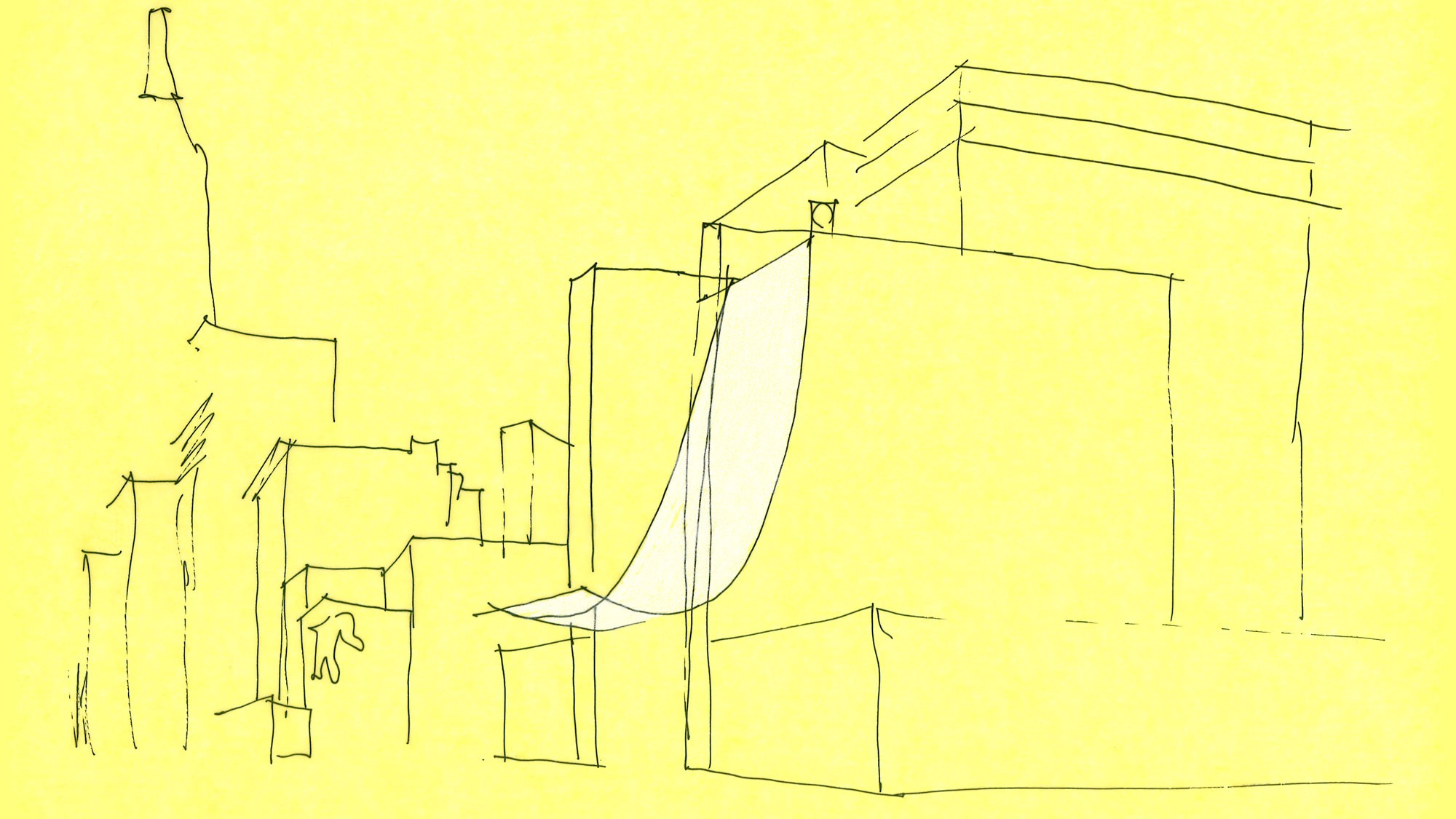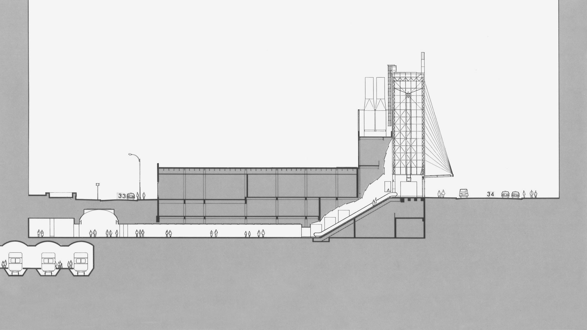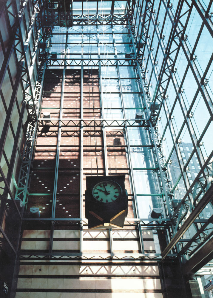 The building shelters pedestrian access to the station and accommodates climate control equipment for the entire Long Island Rail Road concourse below. It is comprised of three elements: a brick outer shell, a steel and glass tower, and a marquee suspended by cables from a mast.
