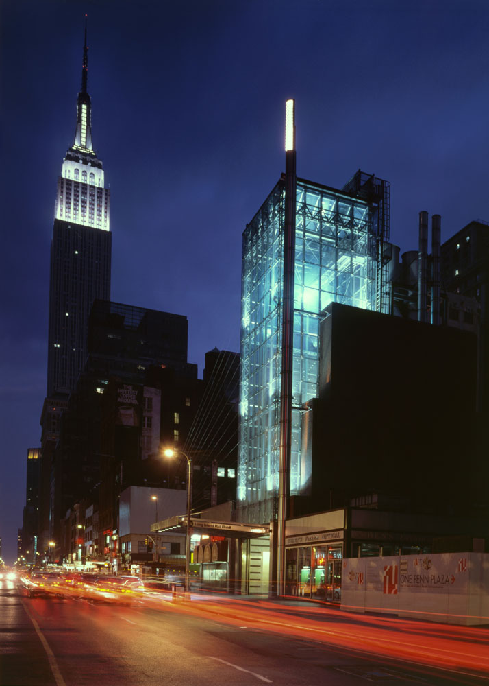 The stainless steel mast and cables support the painted steel and glass marquee, which reaches over the sidewalk of 34th Street. The mast is capped by a radiating light beacon.
