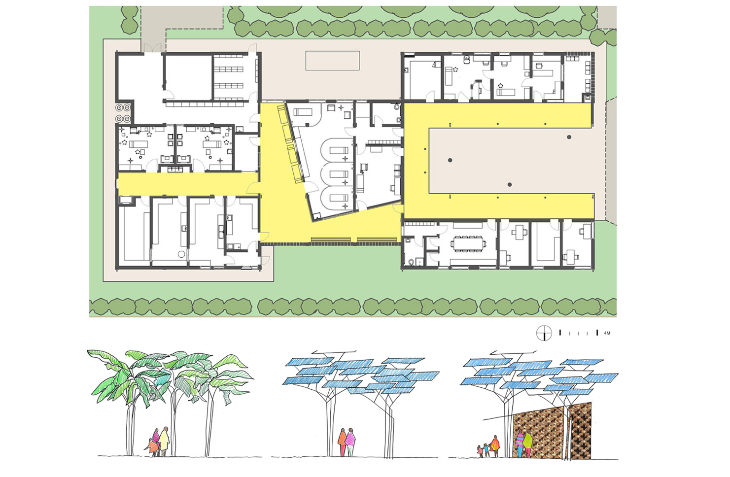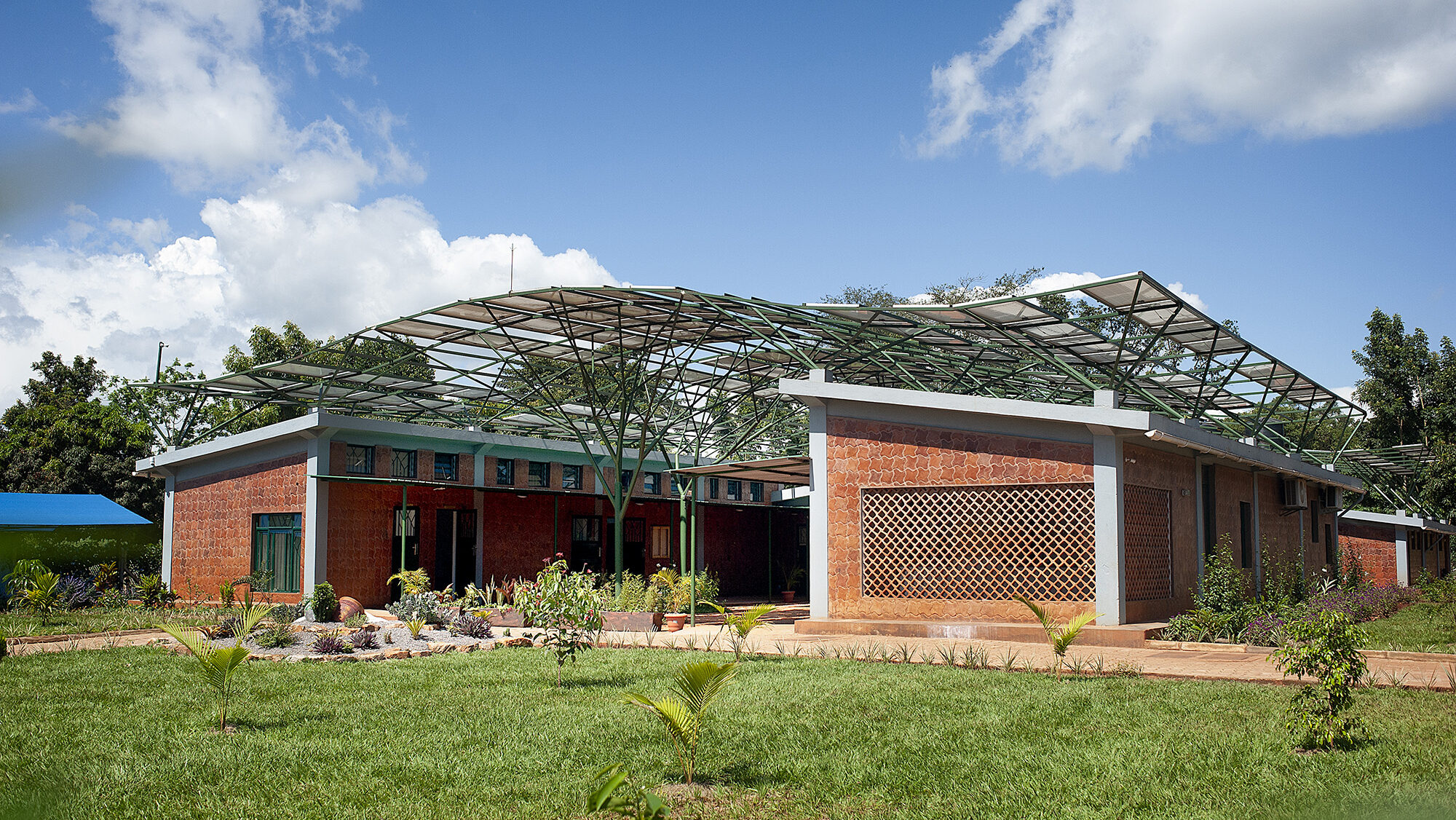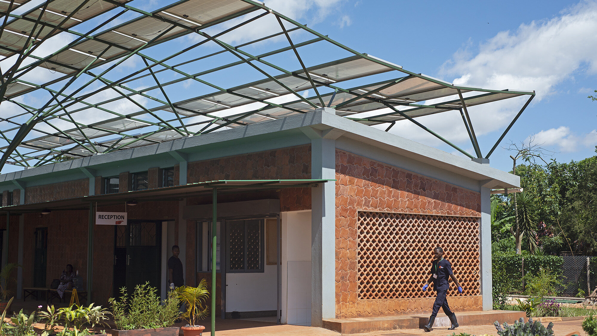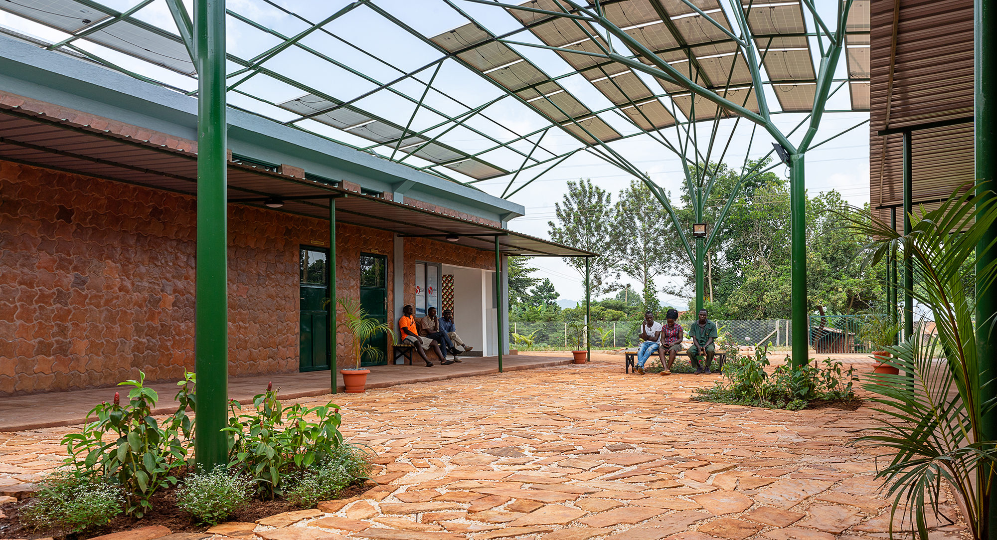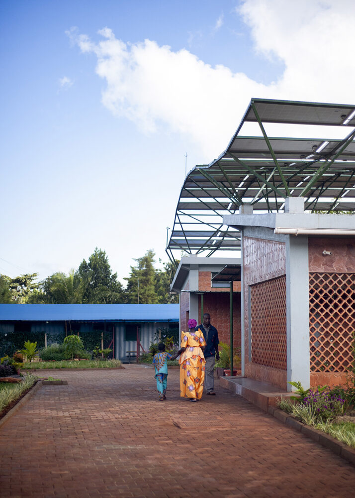 The design for the first of these facilities takes inspiration from the stands of banana plants found on the site in Kyabirwa, a rural village near the equator in Uganda. The solar panels collect sun and provide shade, much like the surrounding banana plants. The solar array shelters and powers the simple modular brick facility beneath. The building is composed of three functional elements: a reception pavilion and a courtyard waiting area for patients’ families, an intermediate pavilion for pre-op and post-op activities, and a sterile pavilion with two operating rooms and related support spaces. The facility provides access to surgical treatments not available to this community before, as well as training for nurses and surgeons on quality surgical care. The medical staff is also supported by telemedicine links to Mount Sinai Hospital in New York, with real-time operating room video conferencing.