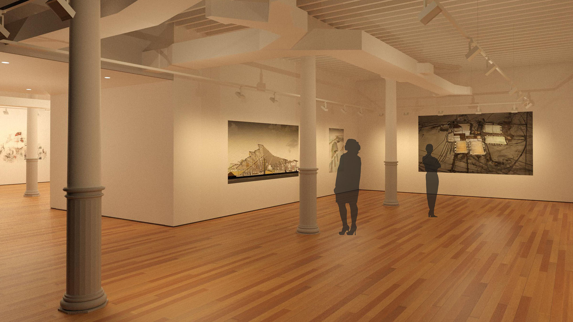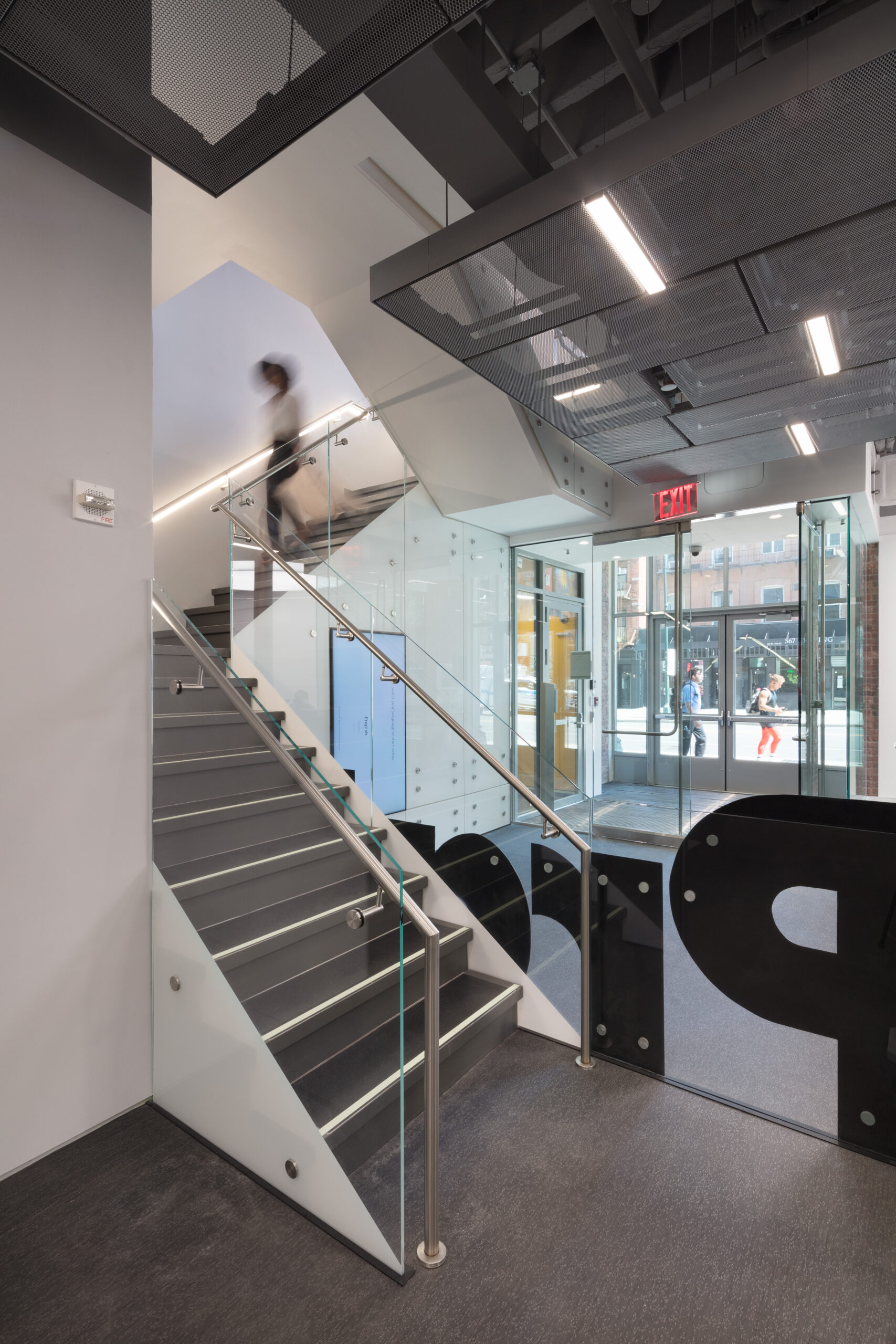 The gallery includes flexible lighting and partitioning systems to accommodate a wide range of curated shows. Interior glass walls engage students and faculty entering the building in gallery exhibitions. The lobby is designed to welcome visitors to the gallery while maintaining security for academic floors above.