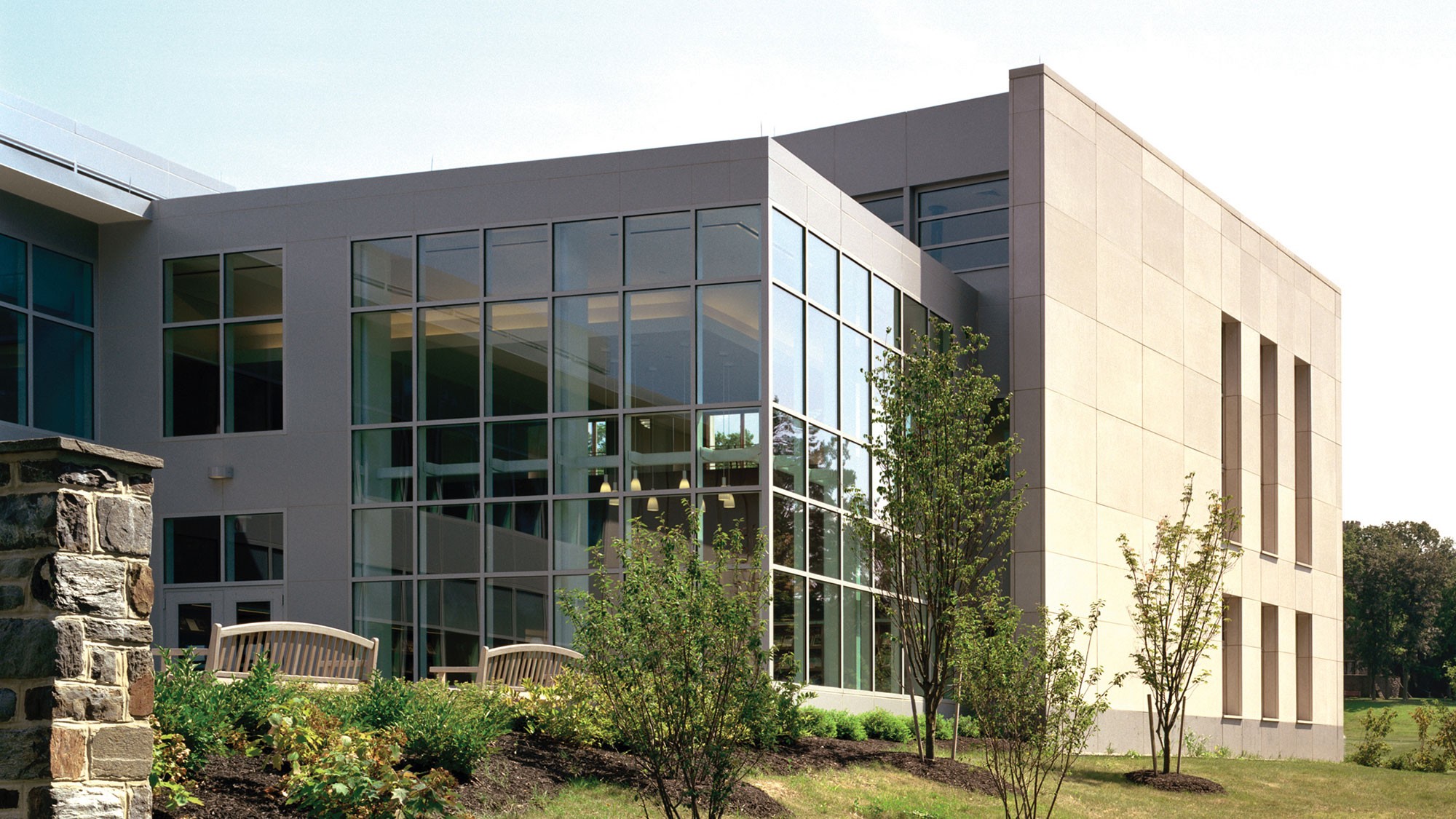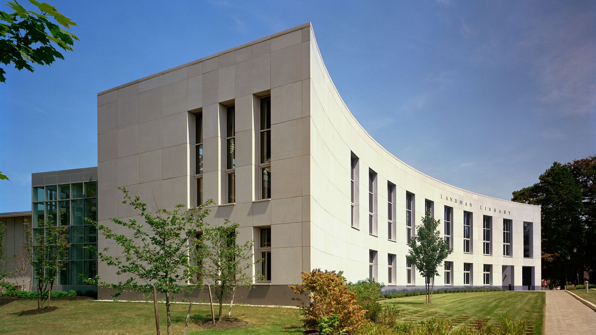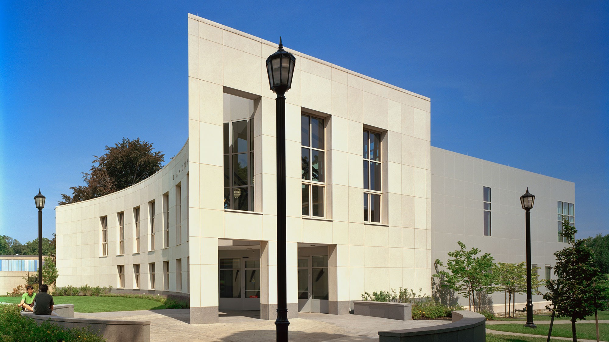 The arc of the library facade embraces the campus green, welcoming students to Arcadia University's center for study and learning.
