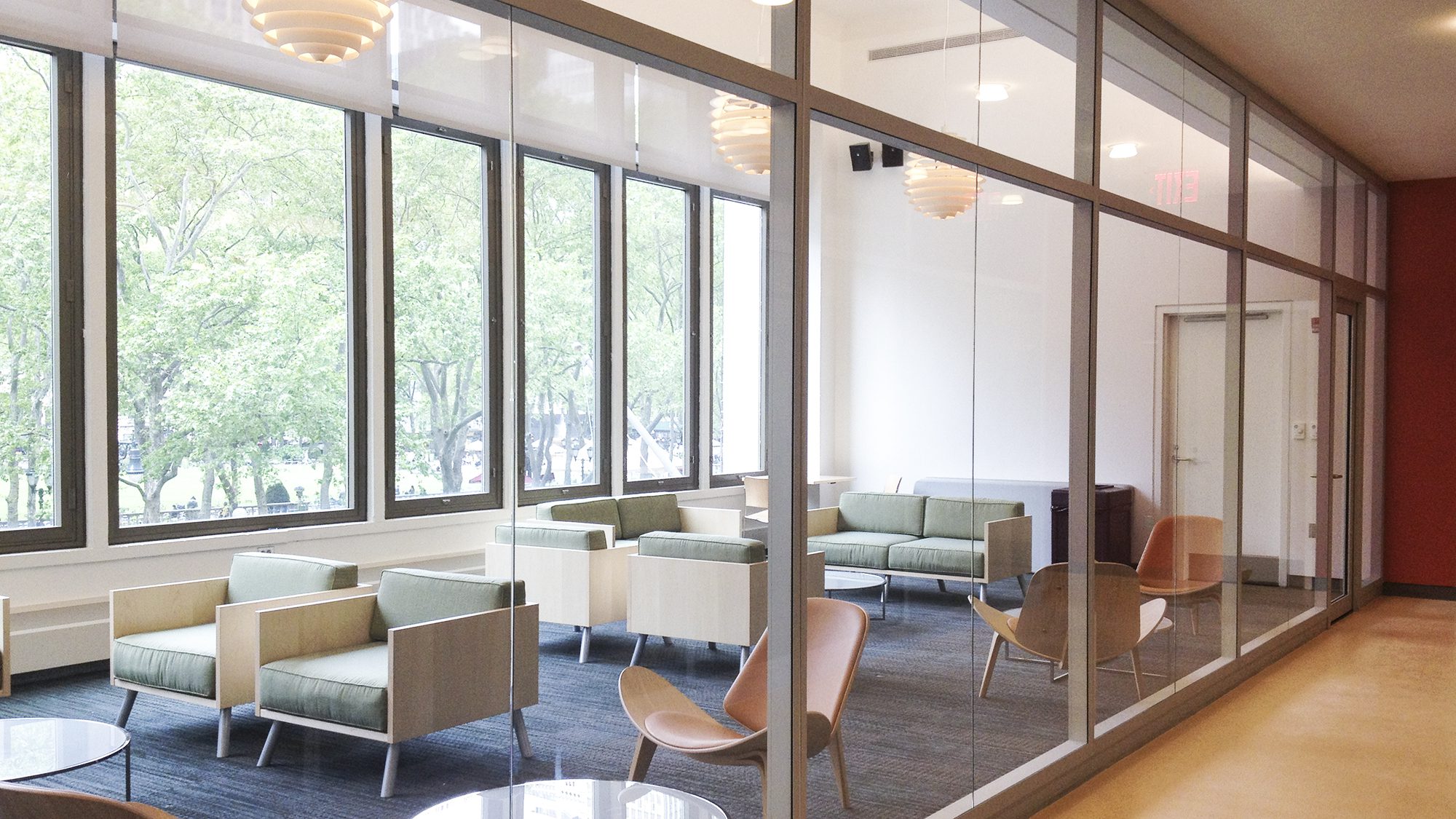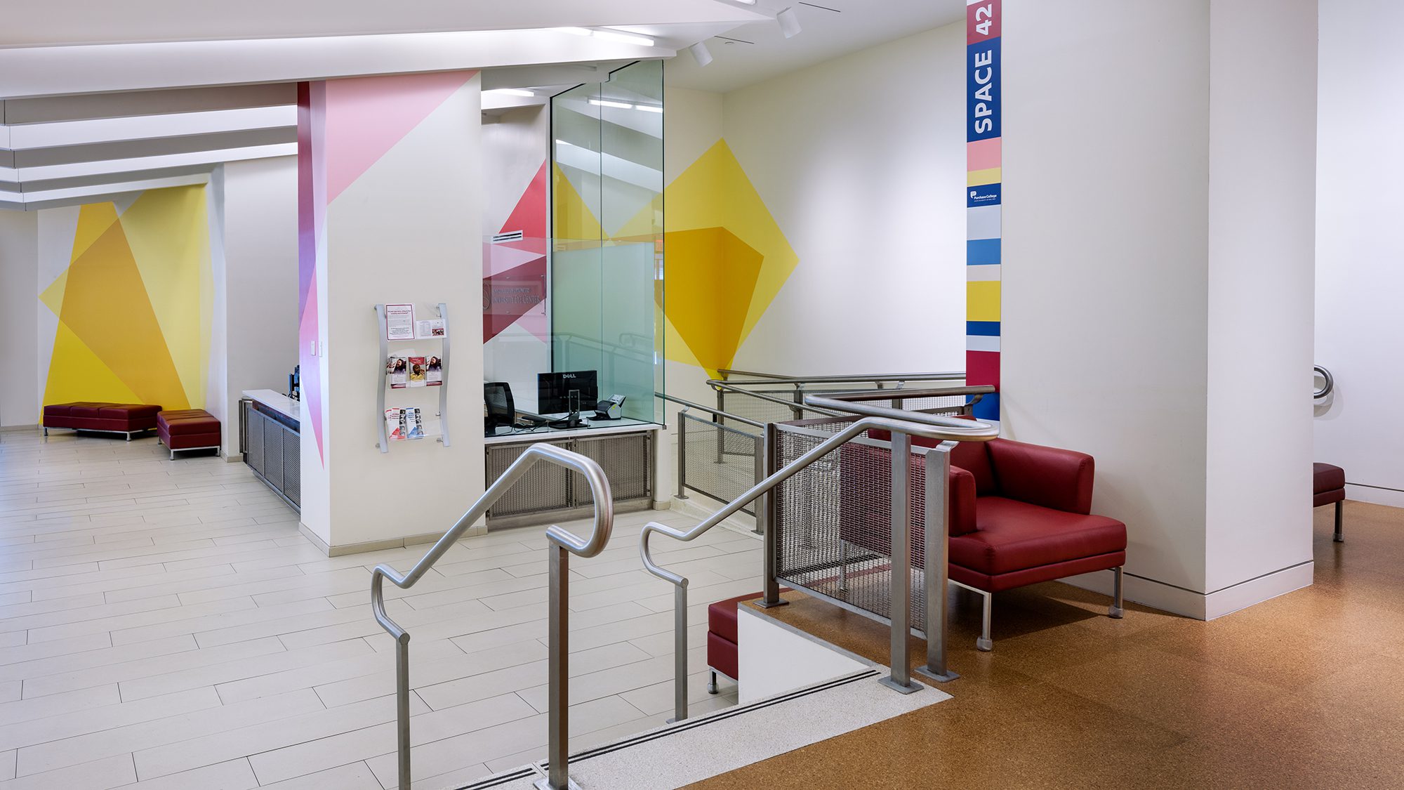 The College of Optometry is a vertical campus on 18 floors of a midtown office building on 42 Street in the heart of Midtown Manhattan. The University Eye Center is one of the largest outpatient facilities in the nation. The redesign of the public lobby on 42 Street was the key to creating a welcoming and easy to navigate patient experience. The lobby relies on light colors, bright non-glare lighting, and clear lines of movement to define reception area, information and security desks, elevators, an art gallery, and a through-block pedestrian avenue. The new Center for Student Life and Learning on the second and third floors is an academic and social hub, with lounges, fitness room, game rooms, and conference spaces gathered around a double-height multipurpose Student Commons overlooking Bryant Park. The Methods Lab is a space for student interaction with optometric patients.