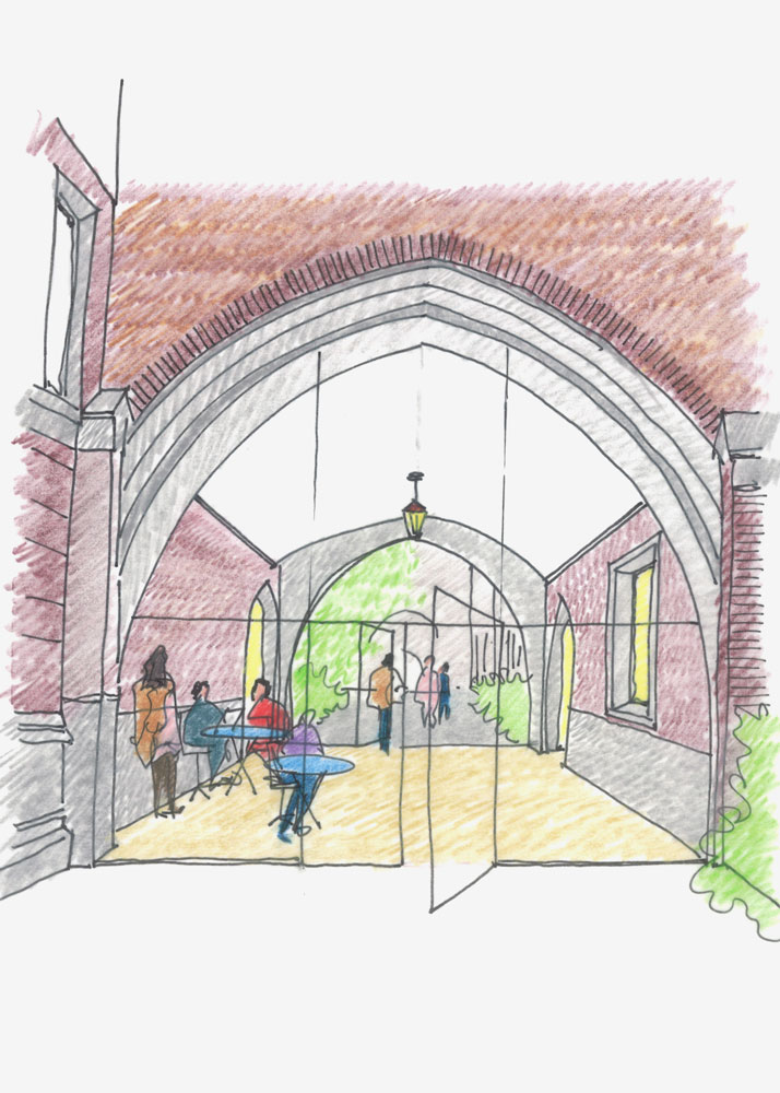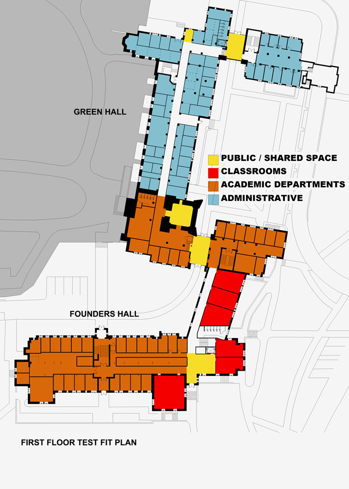The proposed plan joins the buildings to create a single community with shared public spaces with a range of alternatives for re-use of individual spaces, and the creation of new focal points for student life in the Tower Room lounge, the lower campus El Table Café, and new gathering spaces opening onto the North Lawn.