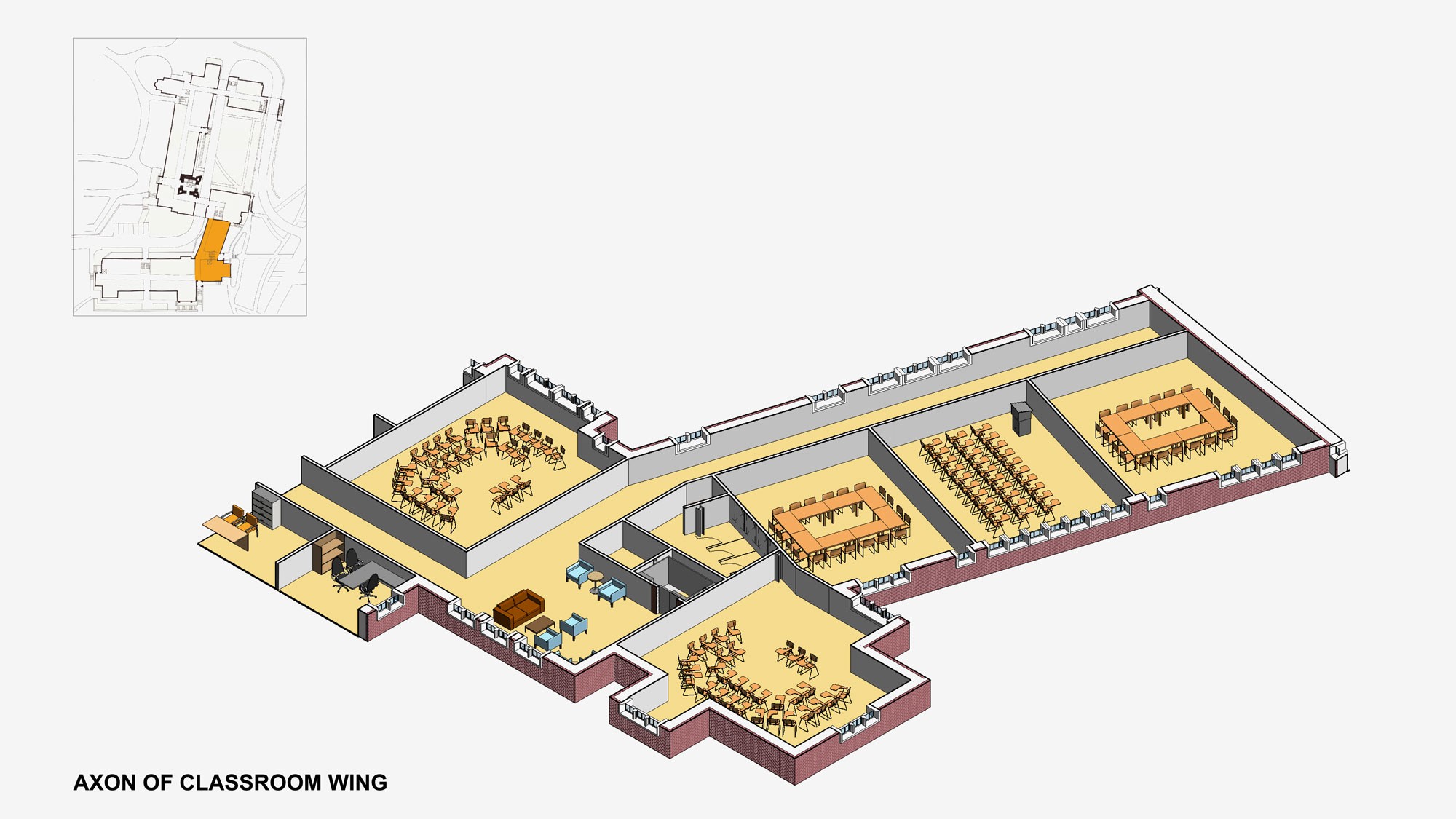 Research for the project included classroom utilization and mix analysis for the entire campus; interviews and discussions with faculty, students, and administration; investigation of physical conditions; and research into modern building code requirements.